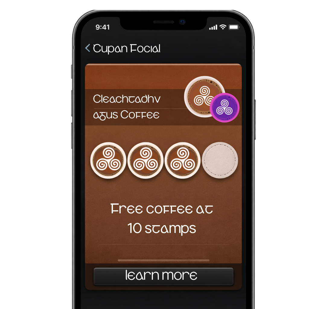 We provide NFC tags for your counter. Customers tap to collect stamps when they order in Irish.